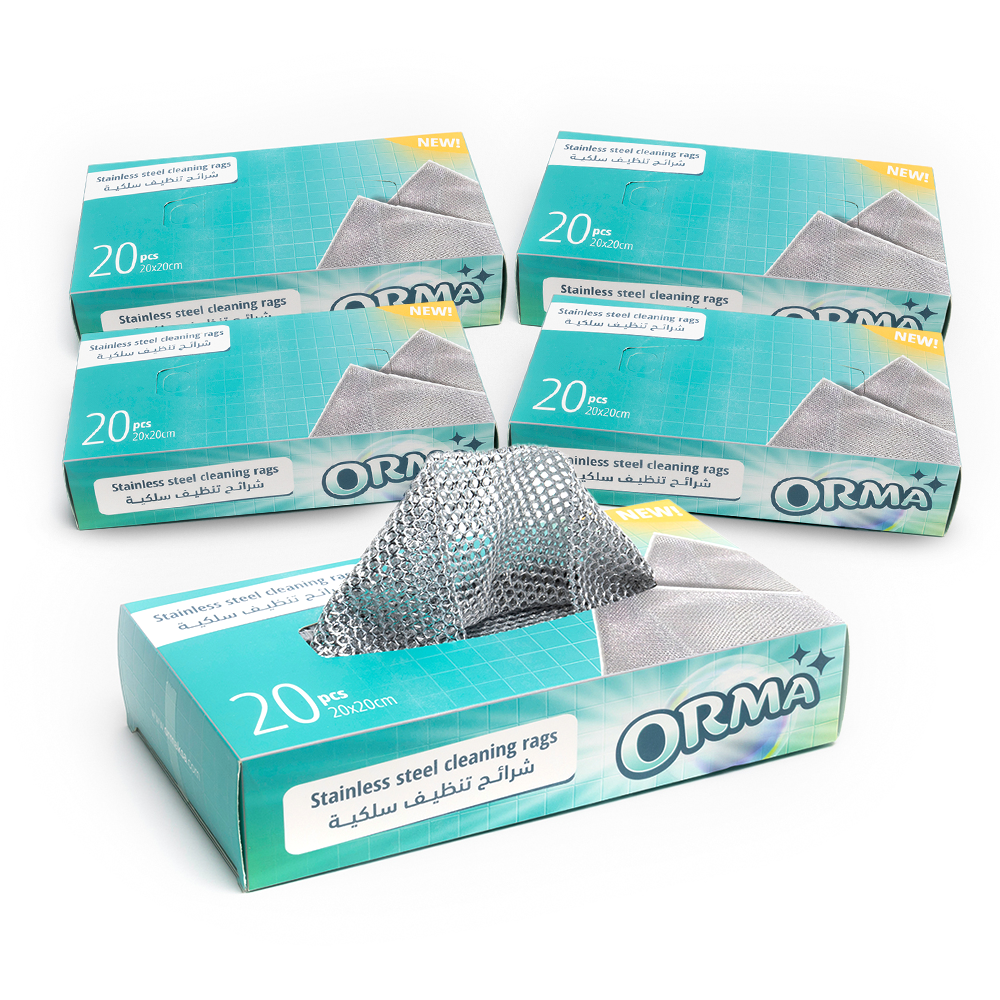 تخلص من بقايا الطعام والشحوم بكل سهولة مع شرائح التنظيف السلكية من أورما المصنوعة من الفولاذ المقاوم للصدأ. تمنحك هذه الشرائح القوة والمتانة التي تحتاجها لأداء مهام التنظيف اليومية بفعالية ودون خدش للأواني.